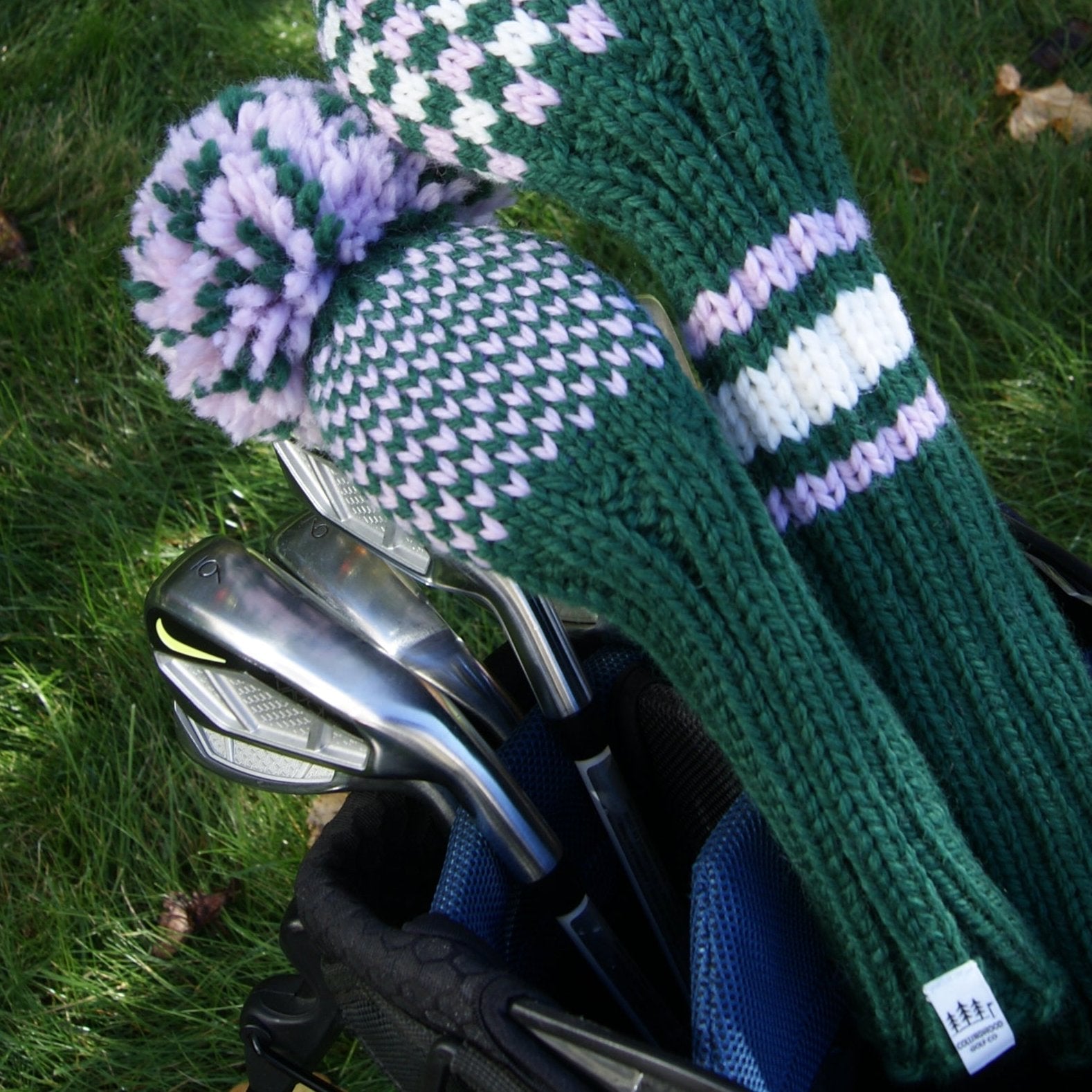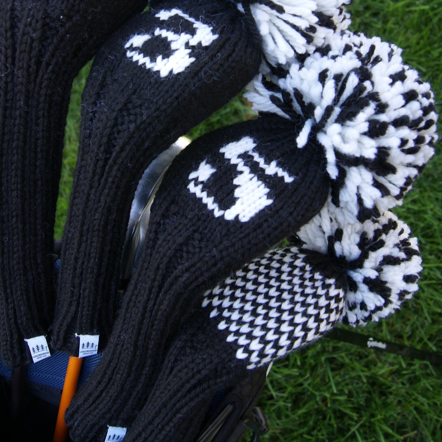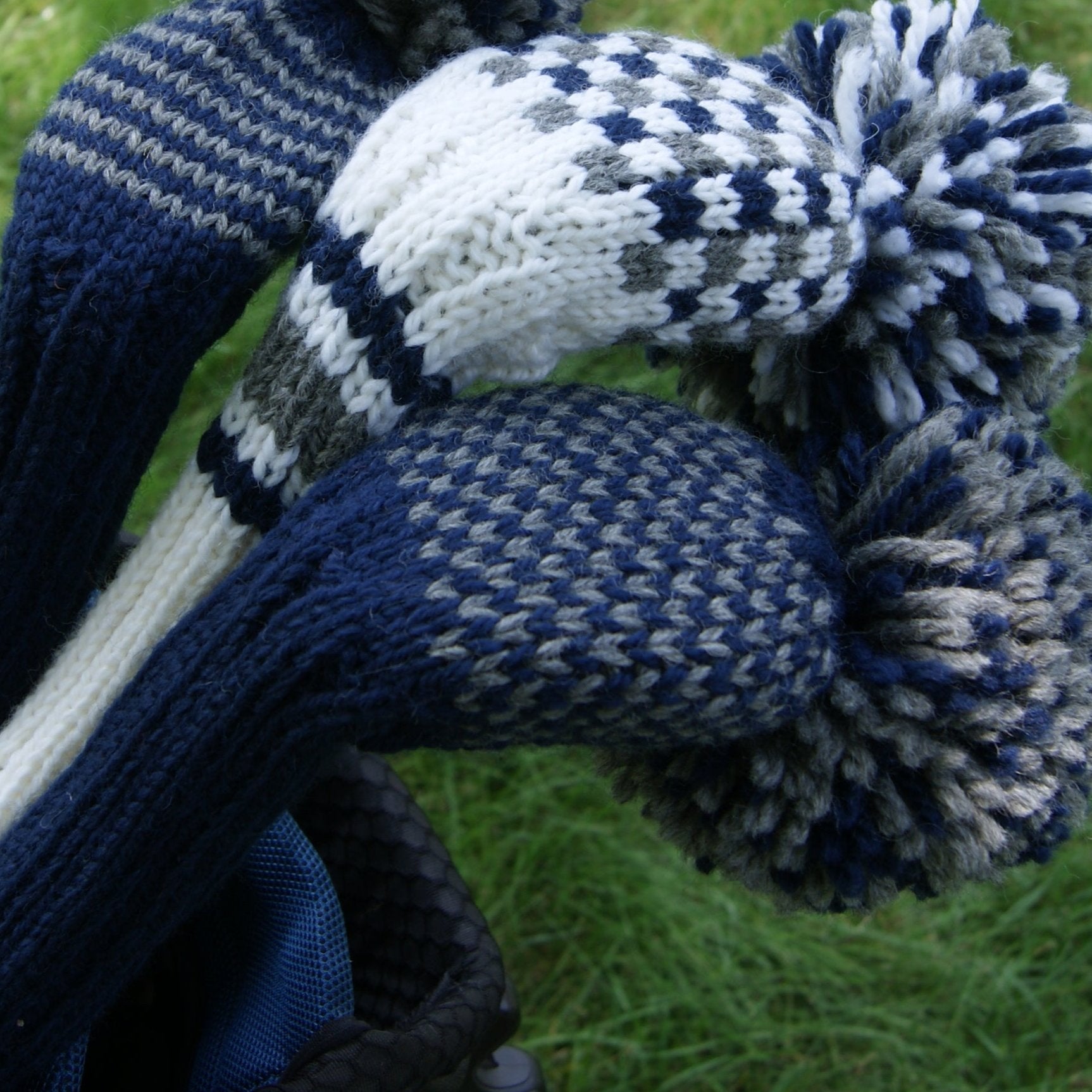 Handmade knit headcover with a small check/houndstooth pattern. See swatch photo for yarn colors.