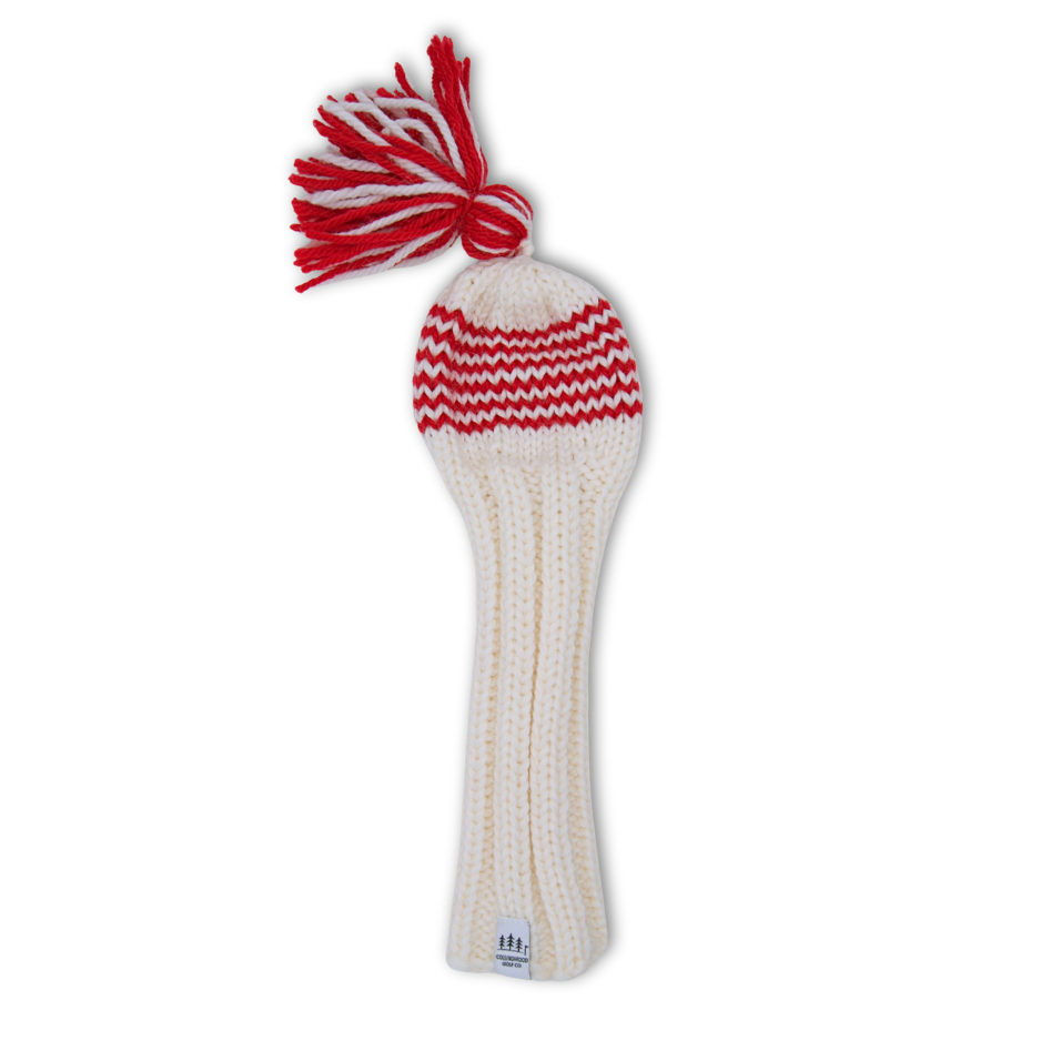 Handmade knit hybrid wood headcover in white with 6 cherry red stripes and a tassel topper.